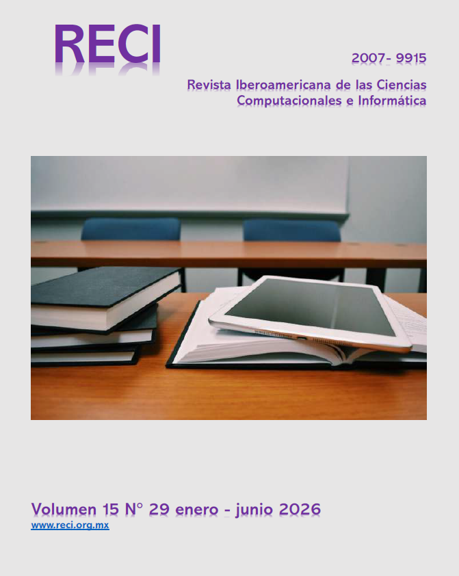 RECI Revista Iberoamericana de las ciencias computacionales e informatica, Vol. 14 Núm. 28 (2025): Julio - Diciembre 2025. Es una publicación semestral editada por el Centro de Estudios e Investigaciones para el Desarrollo Docente A.C. (CENID). Pompeya 2705 Col Providencia C.P. 44630, Guadalajara, Jalisco, México, teléfono 33 1061 8187. www.cenid.org.mx. Dirección electrónica: reci@cenid.org.mx Web: http://www.reci.org.mx/. Editor responsable; Dr. Francisco Santillán Campos. Reservas de Derechos al Uso Exclusivo No: 04 - 2023 - 061317240400 - 102, ISSN 2007 - 9915 Responsable de la última actualización de este número, Unidad de informática RECI, Dr. Francisco Santillán Campos, Pompeya 2705 Col Providencia C.P. 44630, Guadalajara, Jalisco, México C.P. 44658, fecha de última modificación, 23 de enero 2025. Las opiniones expresadas por los autores no necesariamente reflejan la postura del editor de la publicación.